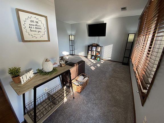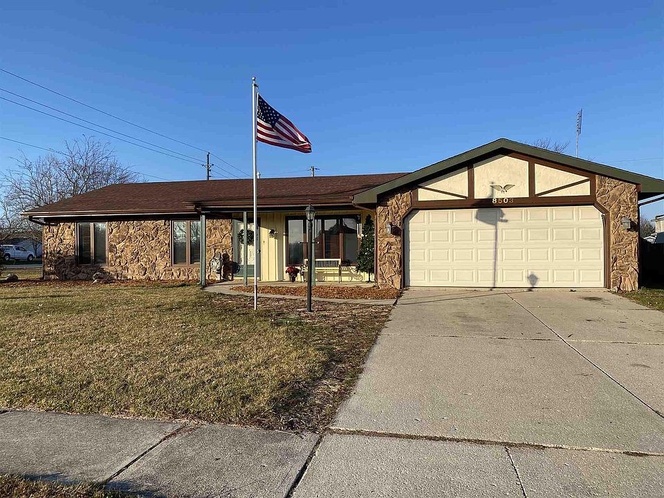 Great Floor plan in this almost 1600 S.F., 3 Bedroom, 2 Bath Ranch Home in Shordon Estates. Stone front and a floor to ceiling, wood burning, Stone Fireplace in the family room with a vaulted ceiling. The Kitchen features an island and a gas range with all the kitchen appliances staying including a dishwasher. Great Privacy Fenced back yard with a firepit area and a storage shed! Water Heater is about 3 years old and the HVAC are Trane units approx. 10 years old. The roof features dimensional shingles which are 6 years old. This home features a foyer area, a living and family room, 2 Full Baths with the Master offering a 4 foot shower with glass doors. The master bedroom has 2 closets and is spacious enough to hold a King-sized bed. Brand new carpet throughout except for vinyl planks in the foyer, kitchen and family room. This is an open floor plan with the family room open to the Eat-in Kitchen. Lots of Fresh paint, too. 2 Car Garage with opener and exterior keypad. Do not miss the Subdivision Park just a couple blocks away! Close to Chapel Ridge with Menards, Meijers, Kohls and Marshalls! Great location!