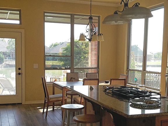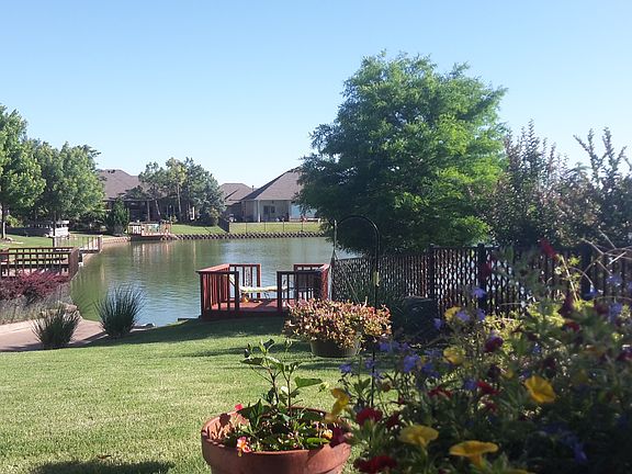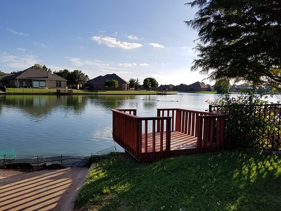 Stunning lakefront home! It s like new and only 3 years old. Loads of large windows have tremendous views of lake. Gorgeous wood look-like tile throughout living areas and hallways, sprinkler system, and walk in tornado shelter in garage! Kitchen has granite and extra large island and is open to living room. Living room has beautiful fireplace and built in nearly floor to ceiling bookshelves. Study is large with built- in desk and bookshelves and separate exterior entrance to front porch. Large covered front and back porches and dock on lake. The master bedroom has a huge walk in closet, plus a linen closet and an amazing master bath, with gorgeous shower and jetted tub. There is a stairway from garage to attic, with possibility of adding a room. This home has it all ! You will fall in love with it ! There is a purchase option available for 315,000 which can be locked in for one year!