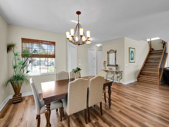 Welcome to your dream oasis in the prestigious Canyon Trails community! This exquisite lakefront home boasts 4 bedrooms plus a loft, 4 bathrooms, and a pool, offering the perfect blend of luxury and comfort. Upon entering, you'll be greeted by an open floorplan that seamlessly integrates the living, dining, and kitchen areas, creating an ideal space for entertaining guests or relaxing with family. The formal dining area adds an elegant touch to gatherings, while the neutral flooring throughout the home provides a contemporary and inviting atmosphere. The upgraded stair railing enhances the home's modern aesthetic, leading you to the upper level where you'll find the versatile loft area, perfect for use as a home office, media room, or additional living space. Prepare to be amazed by the chef's dream kitchen, complete with an abundance of cabinets, granite countertops, and a full granite backsplash. Stainless steel appliances add both style and functionality to this culinary haven. High hat lighting illuminates the space, creating the perfect ambiance for cooking and dining.