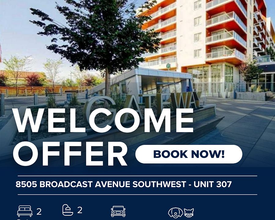 Modern 2 Beds, 2 Baths Apartment/Condo | 2 Pets Allowed No Weight Limit | Monthly Rent for 12 Month Term Includes Welcome Offer Welcome to your new home at 8505 Broadcast Avenue Southwest - Unit 307 - 307 a modern and well-maintained 2 beds / 2 baths / Apartment/Condo offering comfort, space, and convenience. Ideally located close to shopping, schools, parks, and transit. SHOWINGS: Conducted in an open-house format book your appointment today! Prices, availability, and promotions are subject to change without notice. PROPERTY DETAILS: - Furnished or Unfurnished: Unfurnished - Pets: 2 Pets Allowed No Weight Limit. $50 Monthly Fee - Smoking: Non- Smoking - Parking: Underground - Storage Included: Yes - Laundry: - Management Type: Full Management - Lease Term: Long Term UNIT FEATURES: - Living Space:Open-concept living room layout, perfect for relaxing or entertaining - Kitchen: Sleek and modern kitchen with all appliances for a contemporary look with plenty cabinet storage to keep everything organized - Dining Space: Open-concept design flowing into the living space, perfect for entertaining - Bedrooms: 2 Bedrooms featuring ample storage for clothing and accessories - Window Coverings: Includes window coverings for privacy and light control UTILITIES: - Utilities Included: Heat, Water Here's a helpful tool you can use to get a rough estimate of utility costs. LOCATION HIGHLIGHTS: - Outdoor Living: Nearby Parks, Pathways, Greenspaces - Transit & Access: Transit Lines / Major Roads Nearby - Family Friendly: Close to Schools, Childcare, Rec Centres - Local Conveniences: Groceries, Shops, Restaurants, Services Nearby Don't wait properties like this don't last long. Welcome Offer: The listed rent already includes a special savings equal to one month's rent, spread evenly across your 12-month lease. Available on new 12-month leases only.