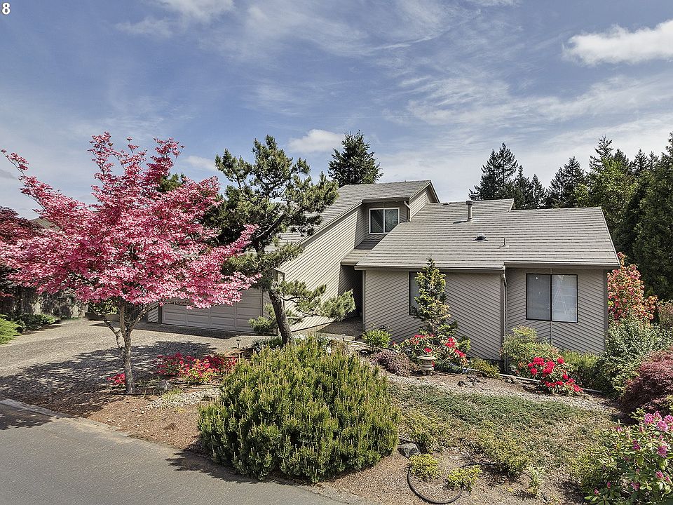 Mountain views & beautiful trees for privacy! Cedar siding, newer exterior paint & roof, spacious patio, layered decking. Mature landscaping & loads of beautiful flowers! Bright home with lots of natural light. Large vaulted ceilings and windows in the living space that create a spacious area. Open kitchen with lots of storage. Quite cul-de-sac located close to nature parks and walking paths.