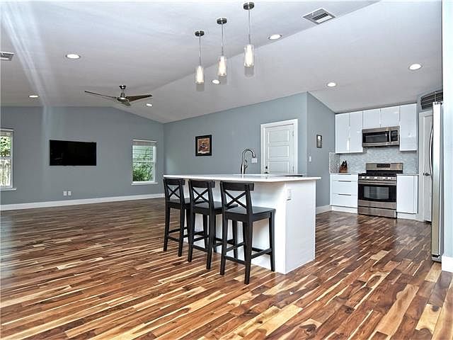 Large 4 Bed, 3 Full Baths, Has Two Master Bedrooms & One of a kind Large One Story Home for the neighborhood. Nearly-new construction down to the studs in Allandale Estates near The Domain & Whole Foods off Steck Ave. Open floor plan with brand new kitchen, Silestone surfaces, Samsung appliances, walk-in pantry & large island with bar. Brazilian Acacia Wood Floors throughout main areas and master wing. Bathrooms feature modern vanities and tile. Master suite includes double vanity, huge walk-in shower, and walk-in closet. Vaulted ceilings, modern lighting & updated plumbing fixtures. Over-sized, private backyard with large deck for entertaining. Newer HVAC, tank-less water heater,newer insulation & much more.