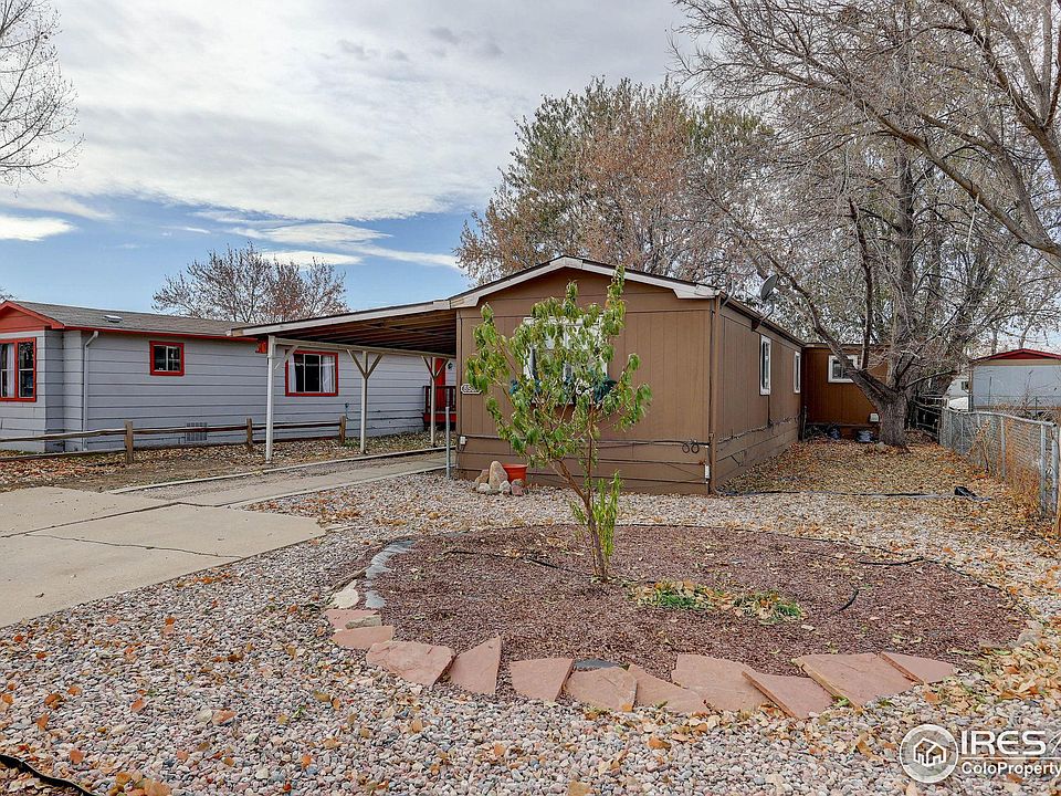 Back on the market, no fault of the home. Location, location, location! If you want easy access to Fort Collins, Loveland, Longmont and the new Amazon Distribution Facility, this home is for you! It sits on a large lush tree filled lot. The Xeriscape front lawn has a young peach tree and is bordered by a split rail fence. Fill the flower boxes with your favorite flowers or plant an herb garden. Enjoy your summer evenings in the yard under the covered back patio. It's the perfect place for a BBQ and to enjoy the lilac bushes. In addition, the property has a shed "village" consisting of five sheds, four of which have electricity. Use your imagination when it comes to filling this extra space...studio, storage, office, shop. It has a tandem carport plus two off-street parking spaces. The home is just down the street from the clubhouse and common amenities. A new roof was put on earlier this month (November 2023). This home has been purged. Welcome home!