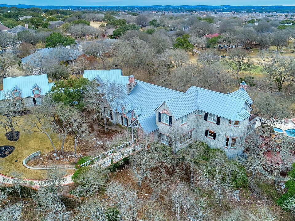 Lovely French Country home designed by architect Jack Arnold nestled along the golf course in the 24-hour security gated Raintree Woods community of Fair Oaks Ranch. Total of 5 bedrooms, 4.5 bathrooms located on 2+/- acres. Interior provides open floor plan, brick walls, vaulted ceilings, crown molding. Spacious gourmet kitchen equipped with ample counter and cabinet space, high-end appliances and multiple sinks. Entertain year round with a spacious covered patio, attractive wooden deck, lagoon style pool, separate hot tub. Boerne exemplary rated schools.