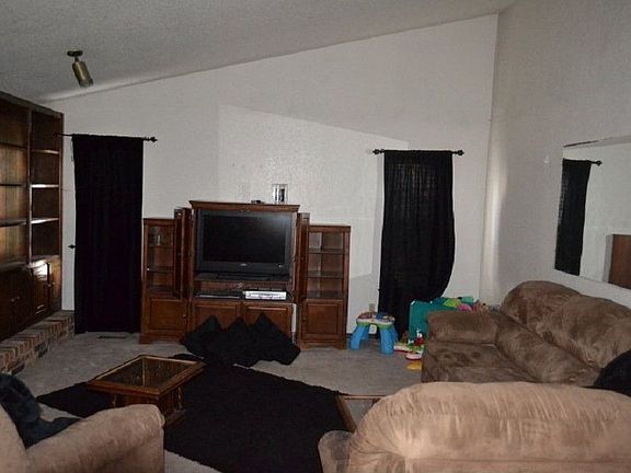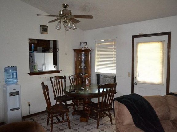 Tall slanted ceiling in living with built-in bookcase. Open dining area. Nice backyard and covered patio. Room sizes are nice.