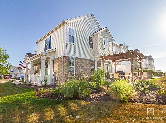 Gorgeous light filled end unit!! Literally move right in! This extremely well maintained home is situated on a cul-de-sac with one way in, one way out residential traffic only. Enjoy quiet evenings sitting under the pergola on the over sized patio watching the stunning sunsets in the open field behind you. Welcome inside where you will find raised 9ft ceilings, brand new luxury vinyl plank flooring, upgraded 42" cabinets, upgraded higher end appliances and under-mount kitchen cabinet lighting. The convenient lower level half bath has a custom shiplap design as well as custom shelving. Check out the beautiful wrought iron banister on your way upstairs where you will find TWO master bedrooms. Need space to spread out? The main master retreat has soaring vaulted ceilings, dual walk in closets and is complete with an en suite which has a raised double bowl vanity. The 2nd master has an additional huge walk in closet. A laundry room, 3rd bedroom and full bath complete the upstairs. The home has a 2 year old water softener, upgraded 6 panel doors and white trim throughout, custom 2" faux wood blinds on most of the windows, upgraded lighting and fixtures, has just been professionally painted and the HVAC was recently cleaned and inspected. Party at your place in your custom built garage bar. Living is effortless with your lawn maintenance and snow removal taken care of. Enjoy the beautiful clubhouse and all it offers with a swimming pool, basketball court, volleyball court, tennis court and exercise room. All of this and the Minooka School District! Make this hidden gem yours today!