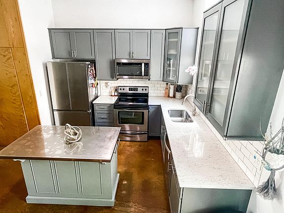 Step inside and be greeted by brown stained cement floors that add a touch of urban sophistication to the living space. The main living level is complemented by an elegant maple wood wall, which not only adds warmth but also houses secret storage spaces. Exposed vents add to the industrial charm, creating a unique ambiance. The kitchen boasts stainless steel appliances, including a new refrigerator, dishwasher, and microwave, perfect for culinary enthusiasts.