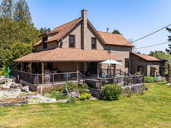 Situated in the breathtaking beauty of Bruce County, this eclectic property offers an extraordinary opportunity for nature lovers and outdoor enthusiasts. Set on a sprawling 86 acres, this waterfront hobby farm has 942 ft of frontage on the scenic Miller Lake. The stunning and charismatic home provides an idyllic retreat in a picturesque setting. With a charming covered wraparound porch and elegant French doors, this 4 bedroom, 3 bathroom home exudes timeless charm and classic appeal. Inside, hardwood floors grace every room, creating a warm and inviting atmosphere. Dedicated office space, ideal for those who work remotely or require a quiet space for productivity; spa room complete with a soothing hot tub. Plus a mudroom/sitting room with a cozy wood stove and 3pc. bathroom close by. Cold cellar provides the perfect storage solution and detached three-bay garage offers ample space for vehicles and additional storage needs. 86 acres of land with extensive trails winding throughout the property and home for an abundance of wildlife. Well-maintained bank barn for your horses, goats etc., with stalls and hydro, along with four run-in shelters, paddocks, sheds, and bunkies for your guests. Large swimming pond with a windmill, dock, and raft are a treat in the warm weather. Beautifully landscaped grounds are adorned with a greenhouse and raised garden beds, perfect for cultivating your own garden oasis! Surrounded by the natural splendor of Bruce County, with its inland lakes, Georgian Bay, Lake Huron, and provincial parks, this property offers endless opportunities for exploration and outdoor pursuits. Truly a must-see, this unique property will captivate your heart and inspire you to spend countless hours immersed in its beauty. Don't miss out on this exceptional opportunity – schedule your showing today and embark on a journey to discover the boundless wonders that await you! See link to additional images in listing!