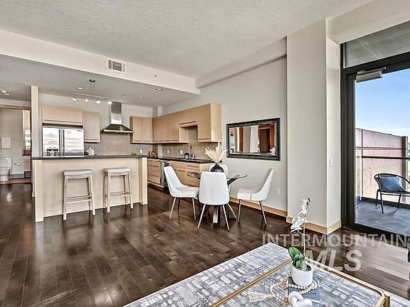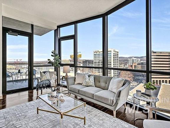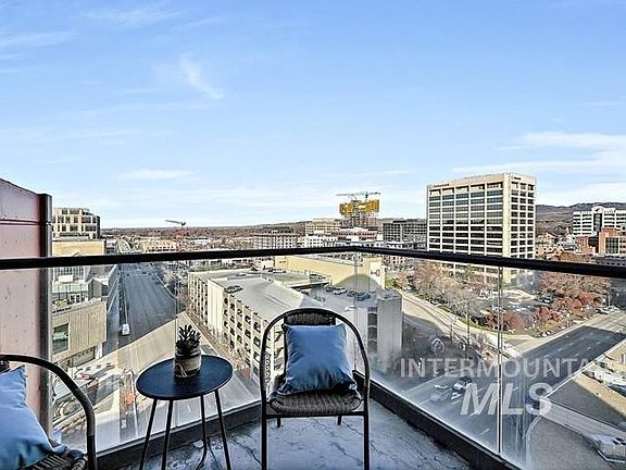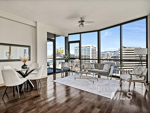 Unlock the door to urban luxury! This premier corner unit in the Aspen Building captures breathtaking views of sunsets, skylines & Idaho’s capitol building…all through its impressive floor-to-ceiling windows. You can live the ultimate urban lifestyle in the heart of downtown, BODO & steps from Boise’s newest movie theater. The moment the elevator doors open onto the 10th floor, a South-facing balcony greets you with stunning vistas, capturing a birds eye view from the Depot to BSU. Inside the end unit, you'll revel in rich wood floors, an open-concept kitchen, and a spacious primary suite that exudes elegance. The second bedroom & its adjacent bathroom provide separated privacy & cozy comfort, completing this luxurious oasis. Enjoy a flexible office/cove, a cozy entry nook, and a private corner balcony within the secure confines of this artistic building. Garage parking + a storage unit. See 3D Tour. Seize this opportunity & find elevated urban living IN the Boise skyline!