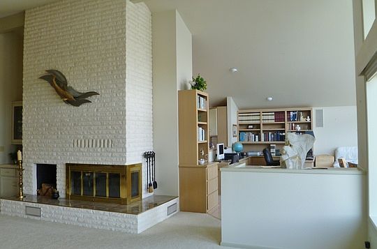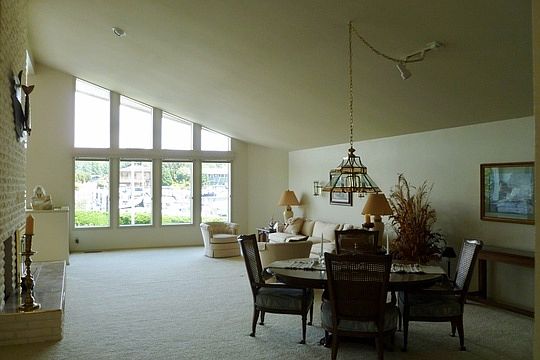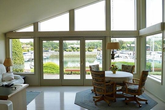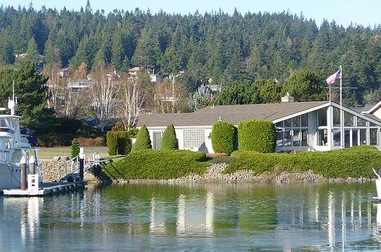 Lovely custom built, contemporary, waterfront home with 60' concrete dock. Easy one level living with open floor plan. 2 bedrooms, 2 bathrooms include a spacious master with built-in storage a walk-in closet, bathroom with back to back vanities, jetted soaking tub, big step down tile shower and doors to exterior. Large living room with cathederal ceilings, floor to ceiling fireplace & wonderful territorial and boat basin views. Well designed kitchen has lots of storage, counterspace, open to family room with eating area, built-in office area and doors to patio. Extra finished room off garage for art studio, workshop or ? Shelter Bay amenities include: clubhouse, 2 swimming pools, tennis courts, 9 hole golf course, private beach, walking trails, playground, marina and more.