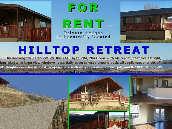 Breathtaking views of the Sierras and the Carson Valley from this private, gated and Re-Envisioned Hilltop Retreat in north Minden / south Carson City. This centrally located 1/2 acre property sits high above upon the hill, next to open space with walking trails and disc golf course. The 1440 sq ft open floor-plan features two bedrooms and baths, an office, a large kitchen / dining / living room with large view windows, french style doors, laminate wood flooring throughout, a vaulted composite wrap around deck in front, a dog run and storage shed in back, and much more. NO TRAFFIC, NO LIGHT POLLUTION, NO NOISE and only one neighbor. You'll fall in love with the privacy and peacefulness of this rare find, as well as the incredible views from every window! POSSIBLE SALE with SELLER FINANCING to a qualified tenant in good standing. Ask for details. NOTE: The Home NEXT TO THIS ONE is also available FOR RENT or SALE. The address is 859 Mica Drive, and it shares a driveway with this home. The owner wants to sell both homes, and will provide SELLER FINANCING for the right people, with approximately 20% down. This Owner also has a couple of other, similar properties coming available in the near future. A possible sale also exists with these as well. Contact Bill for more information. Includes water & sewer. Tenant is responsible for all other utilities.