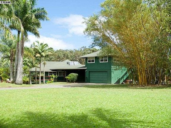 This fantastic home on two acres is a peaceful oasis. Privacy is at a maximum as the mature landscaping screens out the neighbors in every direction. It is on a flag lot, so the property is situated well off the road and there is no road noise. The palm lined driveway leads you to the charming, plantation style home with split pitched roofs. There are three bedrooms, two baths and an office on the ground floor. Upstairs above the garage is a private one bedroom, one bath with its own entrance. Beautiful, solid maple floors run throughout and have just been refinished. Top quality Cherry cabinets fill the kitchen and the bathrooms. The vaulted ceilings in the living/kitchen area are sheathed in pine. Enjoy outdoor living on the covered, Ipe Lanai, just off the living area. There is plenty of room for cars and storage with a two car garage and a two car carport. Mature landscaping with Royal, Queen, Coconut, Areca and other types of palms. There is plenty of room to grow your own food if you desire, or simply buy fresh organic produce from the farmer right next door! Call your Realtor for a private showing. Listing agent is owner and is related to other owner.