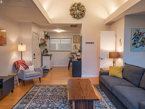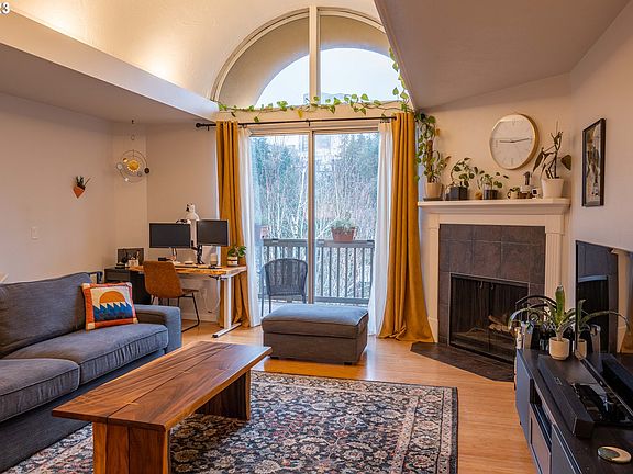 Light-filled two-story condo with vaulted ceilings and deeded parking. Updates throughout. New furnace & A/C. Updated primary bath. Two large balconies with views of Mt Hood plus room to entertain, and garden. Close proximity to OHSU and Downtown PDX.