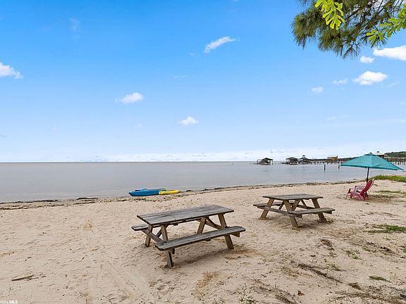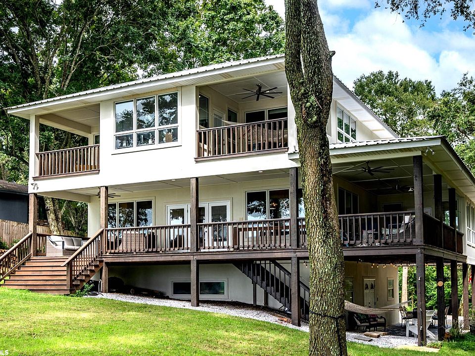 Once you enjoy a Mobile Bay sunset from the front porch of this updated bay house, you will never want to leave! This home provides breathtaking views off the 112' of waterfront from each of the porches, windows, and doors facing Mobile Bay in the main living areas and the primary suite as well. Renovations in 2021 & 2022 include: complete Kitchen and Sunroom renovation with wall removal and new Big Chill appliances, FORTIFIED metal roof, New 26 SEER Carrier HVAC with digital Wifi controlled thermostat, All New plumbing fixtures, All New lighting fixtures, Complete exterior paint and porch stain, All New septic field lines, New exterior front stairs added, and a new lower porch built. The 1200 sq ft of wrap around porches provide the ideal setting for entertaining guests or relaxing on a hammock! The primary suite upstairs has astonishing views of the water, an office full of windows, two private balconies, and a fully renovated en suite bathroom. A total transformation has occurred on the first level with new flooring, fresh paint, updated lighting, and new quartz counters. This level which has it's own entrance can now be used as a separate living area (mother/father-in-law suite or guest apartment) and has a spacious living room, bedroom (a reinforced steel storm room), full bathroom, kitchenette/laundry room, and large walk in storage closet. Make sure to bring your boat to the one of the three near-by marinas. You can walk to your boat at the Fairhope Docks Marina, or ask Fly Creek Marina staff to bring your boat across the creek (like many of your new neighbors), or drive 5-minutes to the Yacht Club Marina to spend the day on the water and enjoy dinner at Sunset Pointe before hopping off the boat and walking home. There are endless outdoor activities in your own backyard: kayaking, crabbing, paddle boarding, sailing, and fishing to name a few. All information provided is deemed reliable but must be confirmed by buyers.