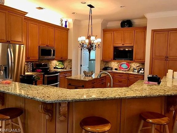 Extended Catalina Model Estate Home; 3 Bedrooms + Den, 3 Baths, Living Room, Dining Room, Family Room, Pool with views of lake and golf course--very private. Electric Storm Shutters, extended garage with 5 panel door, golf cart garage, alarm system (currently purposely temporarily non-operational), wheelchair accessible, completely remodeled kitchen & bathrooms, premium home lot, new roof, new lanai cage in 2019.