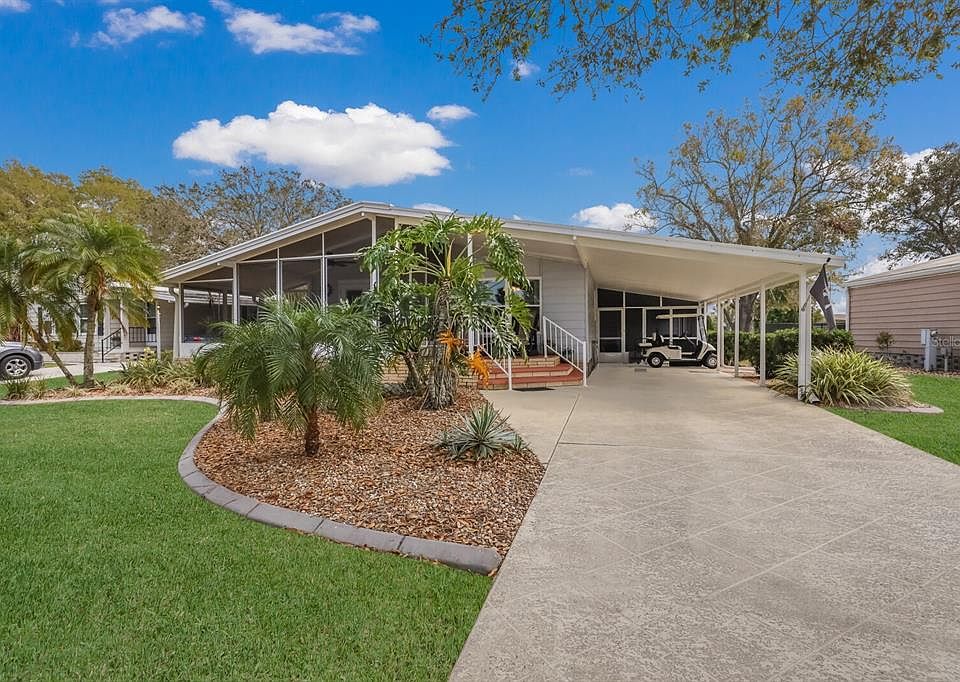 Welcome Home to this lovely, move in ready, mostly furnished home located on a quiet cul-de-sac in the popular community of Imperial Lakes Estates. The 55+ life style, land owned, gated and pet friendly community. Greeting you at the spacious home site is a large, screened front porch shaded by a mature oak tree giving it a park like feel. A peaceful area to enjoy your morning coffee. You will feel the love the owners have given to this home when you enter. The honey toned, easy care laminate flooring, soft wall colors and vaulted ceiling of the spacious living room provide the perfect space to entertain family and friends. Curl up and read a book on the comfortable leather sofa, love seat and chair. The adjacent dining room includes a gorgeous dining table and chairs with a hutch and cabinets providing storage. There is plenty of space for “all the cooks in the kitchen” in this home. The kitchen is “turnkey” and offers an abundance of maple cabinets, counter space, backsplash, and under the counter water purifier. Next to the kitchen is a large bonus room which could be a family room or office area depending on your needs. Beyond this “flex room” you will find the inside laundry room with washer and dryer and overhead cabinets. You exit this room to the 2nd outside screened porch. Another perfect spot to enjoy outdoor dining in paradise. (Grill included) The outdoor storage room with shelf, cabinets, and wet sink provide plenty of room for all your things. A 2nd refrigerator is also included. The cozy, cute furnished 2nd bedroom is all ready for your guests. The original tub/shower in the guest bath has been replaced with a modern walk in shower. The oversized master bedroom easily fits the comfortable king bed and end table which remain in the home. Two walk in closets in the master will help storage. The master bath has large built in cabinets as well as a linen closet. Also provided are a “whole home” surge protector and water softening system. There is no carpet in this home. The Imperial Lakes community center and recreation area are located on a 65 acre spring fed lake. This beautiful community has a lot to offer. Auditorium with dance floor and stage, large kitchen, game room with pool tables and a library. Active residents enjoy the tennis courts, pickle ball, shuffleboard and horseshoes. The two heated pools and spa overlooking the lake offer a relaxing spot to unwind. The abundant deck areas and seating allow plenty of room for all visitors. Non-stop social activities are offered to meet with friends or make new ones. Public golf courses are within minutes of the community for the golf enthusiasts. Conveniently located to I-75 and 275, as well as grocery stores and dining. Whether you are looking for your permanent home or a winter retreat this lovely home will not disappoint.