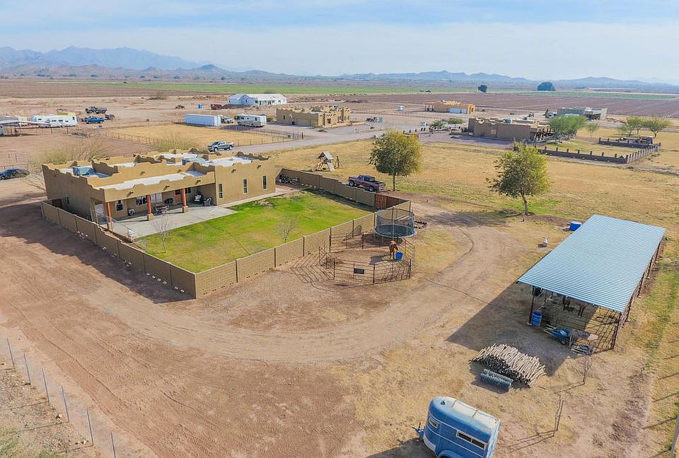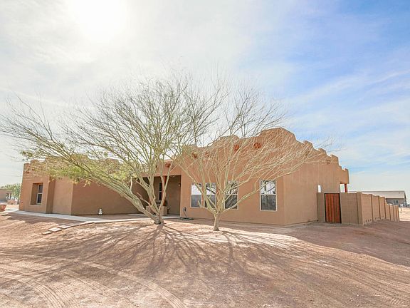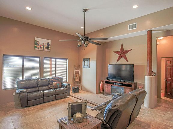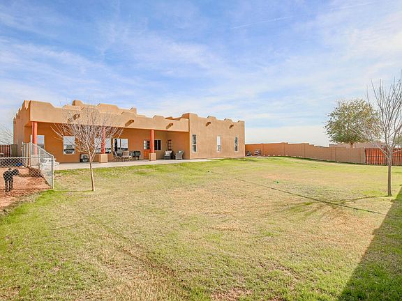Hard to find 2 acre irrigated horse property includes 4 covered horse stalls, grassy pasture, mountain/city light views. This Santa Fe style home boasts 10-12 ft ceilings with a Southwest flair, open Great Room plan, 3 bedrooms +office with a door. Remodeled kitchen with custom cabinets, breakfast bar, granite countertops, stainless steel appliances, wall oven. Flooring is 20-inch tile throughout, no carpet. Solid wood interior doors & ceiling fans all rooms. Master suite has a separate exit to the extended covered back patio. Master bathroom has a walk in shower & jet tub. Bathrooms have been updated with custom cabinets, granite and rubbed oil bronze fixtures. The oversized 3.5 car garage(30x35 ft) will fit your truck & boat. Portable round pen does not convey.