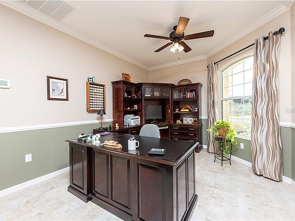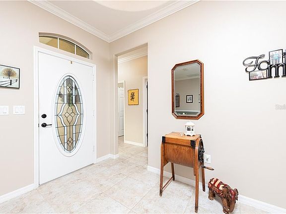 Gorgeous Huntley II located in Candler Hills on the golf course! This home has 3 bedrooms, 2 bathrooms and a 2 car garage. At the front of this split floor plan home you will find 2 bedrooms and a bathroom. the 2nd bedroom has built in shelves in the closet; both guest bedrooms are carpeted. The 2nd bathroom features a walk-in shower (No Tub!), and a large vanity with cabinets. This home has a formal dining room area currently used as an office. The open living room leads into the kitchen. The kitchen features stainless steel appliances, wood cabinets, and an island. The master bedroom has carpet, tray ceilings, and ceiling fan with windows overlooking the golf course. The master bathroom has a double vanity sink with added cabinets, tile, walk-in shower, linen closet, and custom walk-in closet with shelves and French doors. The laundry room has built in cabinets and sink. Garage has additional space for a golf cart/workshop. Enjoy the sunsets on your screened lanai with added birdcage overlooking the 11th hole. Located in Ocala's premier, gated, 55+ community, loaded with amenities, including golf cart access to two shopping centers.