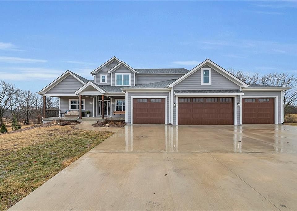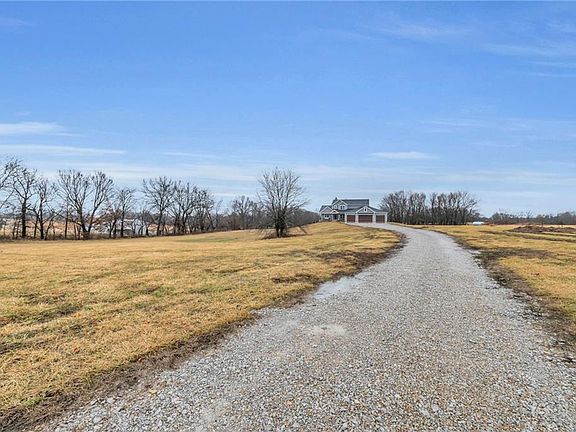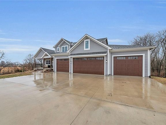 Welcome to this stunning 4-bedroom, 3.1 bathroom, 1.5 story nearly new home in the Kearney School District! Nestled on just under 10 ACRES, it features picturesque scenic views within KCMO city limits. This home offers nearly 3,500 finished square feet of luxurious living space. Custom built and thoughtfully designed, this property is a true gem. BRAND NEW interior paint throughout. The spacious main level features beautiful luxury vinyl plank, a cozy wood burning stove in the living room, built-ins with storage for wood, and an open-concept layout that seamlessly connects to the kitchen. The kitchen is a chef's dream, boasting quartz countertops, TWO dishwashers, induction oven, open shelving, tile backsplash, soft close rift sawn white oak cabinets, and a walk-in pantry. The extra large primary suite offers a spa-like experience with a large walk-in closet and massive tile shower. A versatile office/study or playroom greets you at the front entryway. Laundry is conveniently located off the garage, next to the drop-zone, complete with cabinets for storage, and an extra large folding area. Upstairs, you'll find a loft area perfect for additional relaxation, work, or play space. 3 additional bedrooms, ALL with walk-in closets, and 2 full bathrooms with quartz countertops and LVP. The 4-car garage is extra wide and deep, providing ample storage and workspace. The walkout, unfinished basement is stubbed for a full bathroom, allowing for future expansion. Outside, a darling front porch greets you on the drive up, and behind the home features a covered composite deck to enjoy the tranquility of your surroundings. Enjoy nearly 10 acres to build your dream workshop or outbuilding. The land also features several fruit trees and a strawberry and raspberry patch. This remarkable home was constructed using 2X6 lumber, making it stronger and allowed for more insulation. It has been well maintained and is just waiting for its new owners!