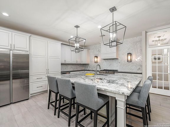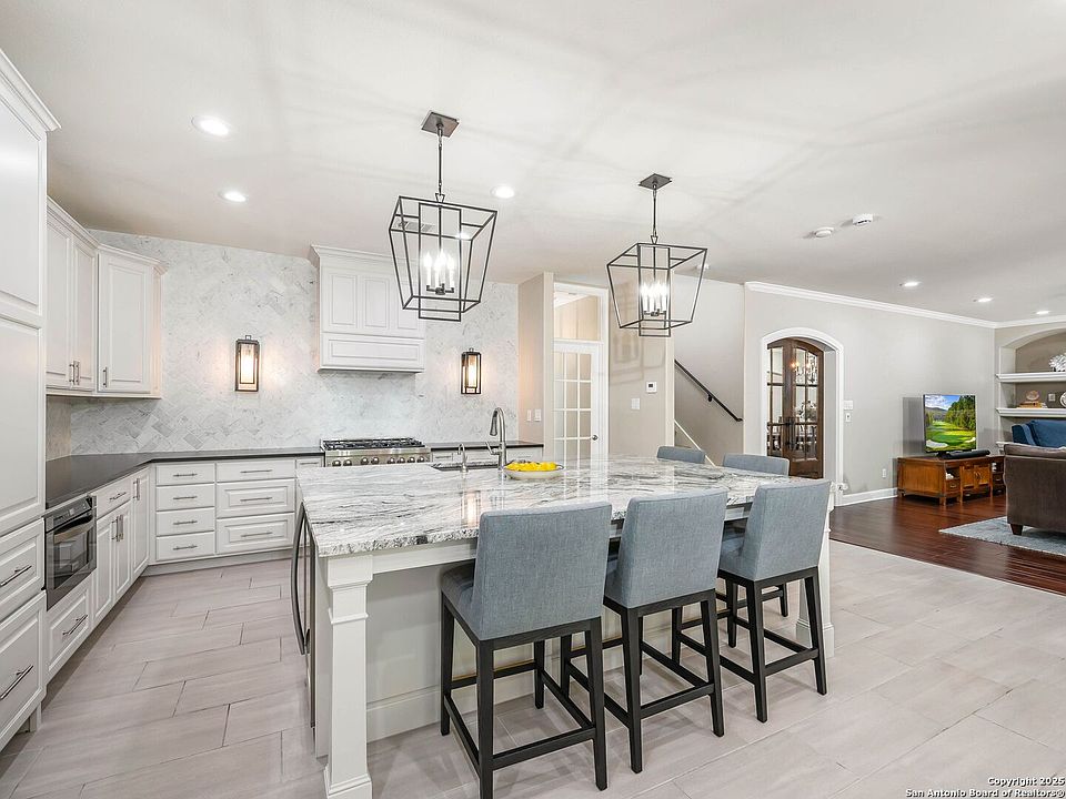 - Three Living Area, Separate Dining Room, Eat-in Kitchen, Two Eating Areas, Kitchen Island, Breakfast Bar, Pantry, Study/Library, Game Room, Utility Room Inside, Secondary Bedroom Down, High Ceilings, High Speed Internet, Walk-In Closet(s), Ceiling Fan(s), Chandelier, Solid Counter Tops, Custom Cabinets