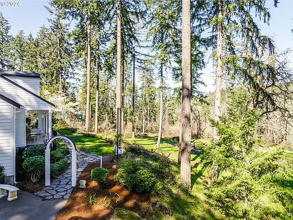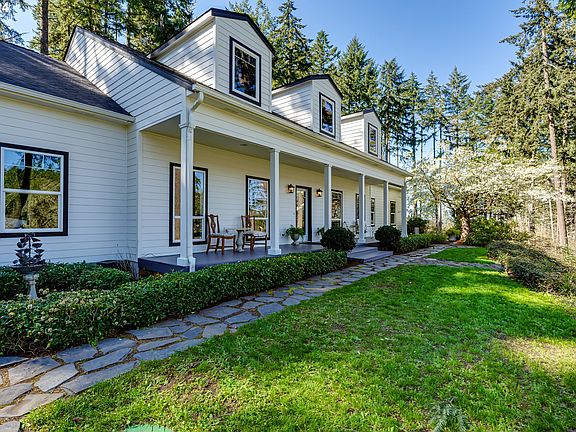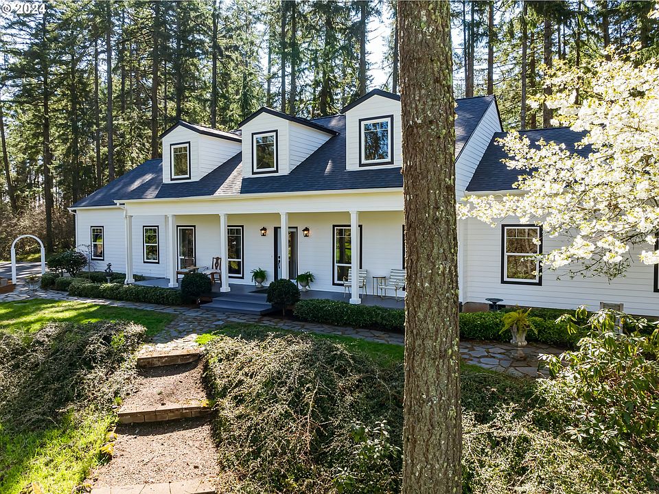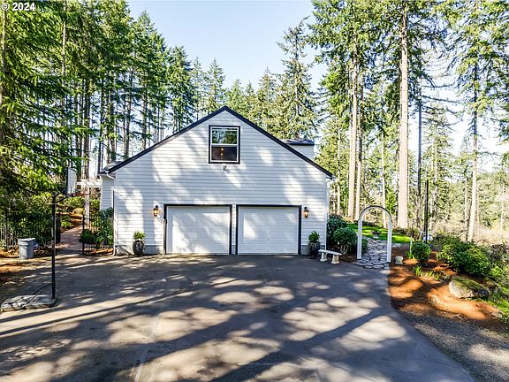 Dreamy home nestled in the serene embrace of nature on a park like 4.66 acres. This stunning property has a covered front porch, perfect for enjoying tranquil mornings and serene evenings. Inside, rooms are nicely separated with flexible spaces throughout that have been thoughtfully designed. Combination living and dining area with a custom bar and cozy fireplace, french doors lead to a fenced patio garden with a water feature. Kitchen is open to the living area, has gas cook stove + built in oven and butlers pantry. The sunroom overlooks the patio. Primary bedroom has double vanities and sinks, jetted tub, step in shower and a walk in closet. Upstairs with generously sizes bedrooms, hallway/loft area and bath. The family/bonus room is currently being used as a bedroom. Additionally, there is a carriage house with a detached two car garage + storage bay, laundry area and a second story guest house (approx 400 sq feet, included as additional sq feet). Raised garden beds that are fenced from wildlife, and fire pit for gathering under the stars. RV parking space as well. 2022 updates include: Roof, HVAC in home and carriage house, exterior paint, most interior paint, refinished wood floors. This is a must see property.