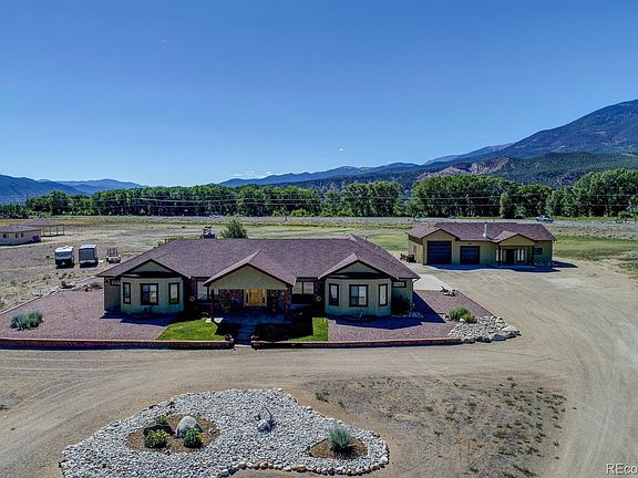 One level mountain home is located five minutes from Salida on 4.72 acres with a small surface irrigation water right. This property creates space for flexible uses! The main home's spacious 2622 SF open floorplan includes a lovely master suite with stunning western mountain views. Large attached bath with soaking tub. An office room is located down the hall. 2 additional bedrooms with bath on the hall and views from every window! Forced air propane heat with central AIR! A large utility room connects to a 3 car attached garage. Fully landscaped walled courtyard off the living area offers sheltered apace for outdoor living. A second 1632 SF building was built in 2016 for use as a workshop/additional garage. This building has 2 garage doors, one of which is extra high to accommodate large vehicle or boat. Interior is heated, wired, drywalled and floors are finished. It includes a separate "man-cave" room. Bring your own ideas to this unusually flexible space. Well is augmented and can be used to water up to 2 head of livestock along with irrigation of up to 1 acre. Surface irrigation right off ditch to the south of property is owned/administered by the Chaparral HOA.