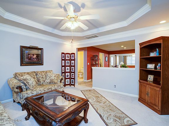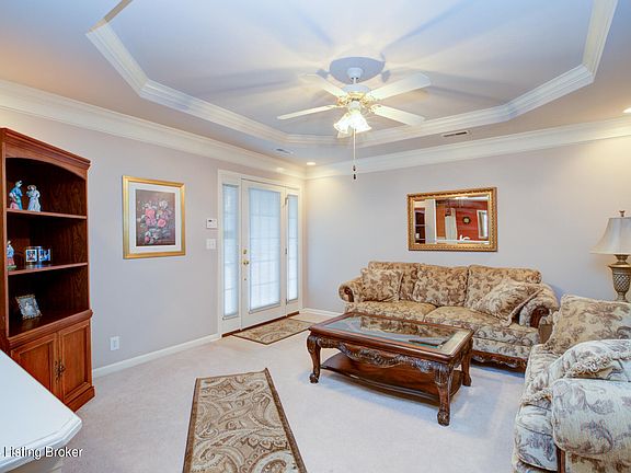 Previous Model Patio Home well maintained and close to Gene Snyder. Open floor plan with eat-in kitchen, lots of cabinets, and pantry. Refrigerator, range, microwave & dishwasher to remain. Sunroom off of kitchen w/gas fireplace and lots of natural lighting leads to patio. Primary bedroom has walk-in closet. Utility room with vanity/sink and washer/dryer that will remain. Some trey ceilings and custom trim throughout. Attic is floored for extra storage. Home has a wired security system. Newer shower installed in primary bath. Carpets cleaned week of 1/16/23. Maintenance fee is $226 a month which includes water, garbage, roof and common grounds upkeep. There is a clubhouse to celebrate those special occasions. Not FHA or VA approved. Buyers must close at Borders & Borders Attorneys.