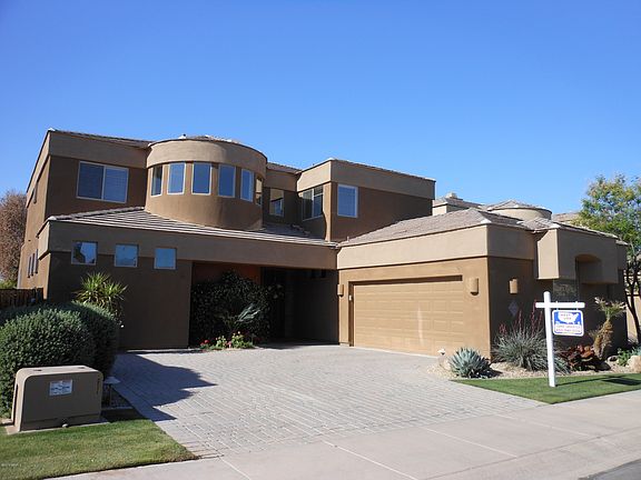 PRICE REDUCED! Highly desirable gated beautiful custom home at the Village at Scottsdale Links. When you enter your custom home you will notice the castle stone flooring & gourmet dream kitchen w/ large island & monorail lighting over the island, granite countertops, blk appliances, 5 burner gas cook top, built in refrigerator, microwave/convection oven,great walk in pantry. Master bedroom is DOWNSTAIRS has been expanded with coffered ceilings,designer window covers,master bath has travertine & stone countertops & Kohler cast iron 6ft. jetted tub. Premium golf course lot on Silverado golf course with Magnificent VIEWS....VIEWS of Camelback Mt,southern exposure in your entertaining resort backyard. Flagstone patio to your waterfall/spa,gas fp with built in BBQ. Meticulously maintained home