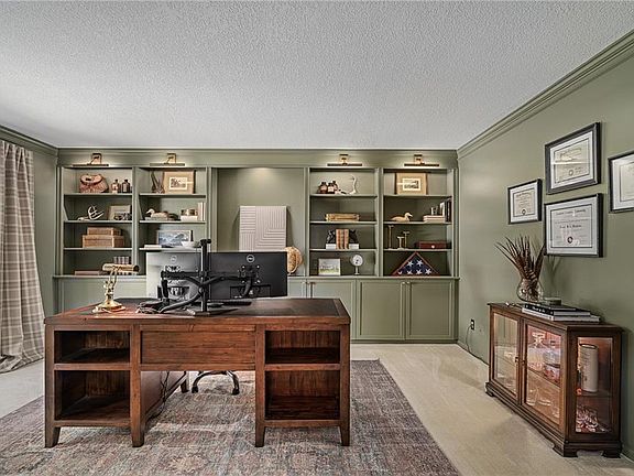 Step inside the spacious entry with travertine stone tile floors to be greeted by French doors leading into the recently remodeled main floor office. Noteworthy custom-built cabinetry and shelving, drenched in a timeless soothing green, create an inviting and inspiring workspace.