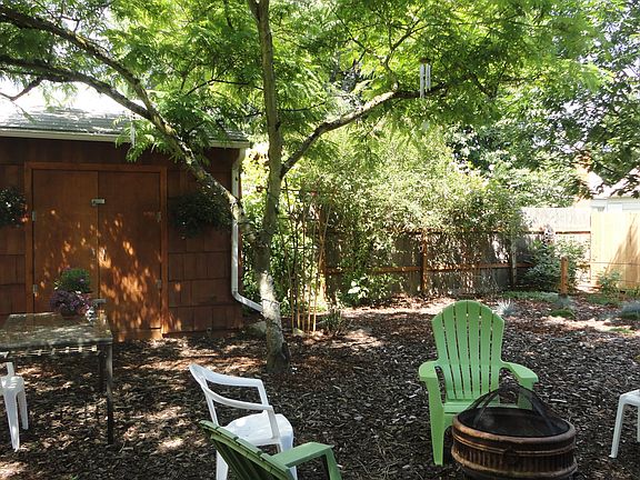 12 x 8 cedar-shingled shed with windows and double door; refinished hardwood floors in the living and bed rooms; remodeled bathroom; completely new kitchen, dining, and pantry with cork floors and energy efficient appliances; crown moulding and architectural detail; new ceiling fan, lighting fixtures, windows, and exterior doors throughout; fully fenced large back yard with deck and mature landscaping; landscaped front yard with detailed front porch big enough for a table; off-street parking; and, lots of additional storage in attic