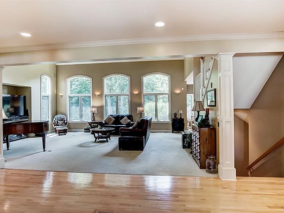Gorgeous home designed by E. Gerald McCardle and built by Floyd Henny nestled on nearly 3/4 acre wooded lot at the end of quiet cul-de-sac. The concrete drive winds to the back for access to the 3 car garage. Grand Foyer leads to an open floor plan with formal dining to the right and sitting room with fireplace on the left. Fireplace is flanked with custom built-ins. Beautiful hardwood floors lead to a massive living room with cathedral ceilings, a wall of tall arched windows, a cove for entertainment equipment and built-ins. The kitchen has same custom cabinets as the breakfast area. A 2-tiered granite L-shaped island with second prep sink and gas stovetop on the lower tier. The refrigerator has custom cabinet covering. Double Oven. Huge walk in pantry. Home Office has custom built-in desks and upper cabinets. Massive laundry room with new tile flooring has storage pantry, upper and lower cabinets and abundance of counter space. Main floor master with double tray ceiling, built ins for television and storage. His and Her sinks and vanities. Jetted Tub and Separate Shower. Upper level has 3 large bedrooms, 2 share Jack n Jill 3rd has private full bath, extra playroom and loft area. Perfect entertainment basement with several living areas. Full Bath and Half Bath. Enormous storage room in basement with garage access. Rustic seasonal room off kitchen. Park like backyard. Gorgeous deck with built in seating. New AC/Heating 2011.