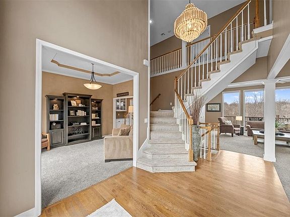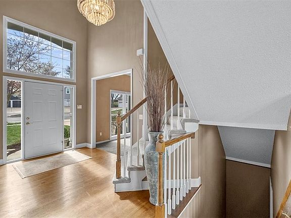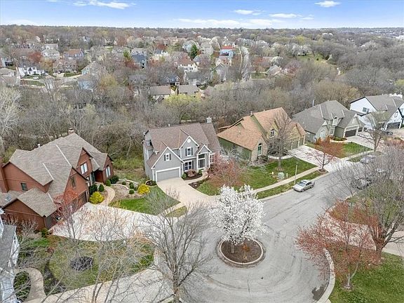 Welcome to this stunning custom-built home, perfectly situated on a premium cul-de-sac lot backing to trees and greenspace. From the moment you step inside, the grand two-story entry and expansive picture windows captivate, showcasing some of the best views in the area. This spacious open floor plan features soaring 10' ceilings, a striking split staircase, brick fireplace with raised hearth and elegant built-ins. The recently renovated kitchen boasts raised 9' painted cabinets with under-cabinet lighting, quartz countertops, new backsplash, built-in spice racks, and rollout pantry shelves—perfect for the modern chef. Spacious bedrooms and a luxurious primary suite which offers incredible views from the floor to ceiling custom windows. Recent updates include new stair and second-floor carpet, fresh paint throughout much of the second level, newer exterior paint, and a composite deck replacement. Some of the many other upgrades include motorized Hunter Douglas Silhouette blinds, heated tile flooring in the primary bath, updated custom windows across most of the backside of the home, beautiful outdoor lighting and so much more! Nestled in a prime location with easy access to major highways, this home is just minutes from Lenexa City Center, Shawnee Mission Park, Sar-Ko-Par Trails featuring an incredible outdoor aquatics center, elementary school in the neighborhood, shopping, dining, and more. Don’t miss your chance to own this extraordinary home!
