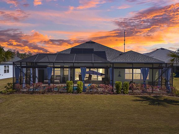 This home is situated on a small cul-de-sac near the amenities and entry/exit gates. From the moment you park on the extra-long driveway to walking inside and catching a glimpse of the saltwater heated (gas) pool with the pond view, you will fall in love. In the evening you can enjoy the views of the incredible sunsets while you relax by the pool. You can also enjoy your privacy with the custom Sunbrella privacy curtains around the entire lanai. Inside you will find an open floor plan with a formal dining area that is currently used as an office to enjoy the beautiful outside view. This floor plan offers the ''guest living area'' with 2 bedrooms and a ''den'' area in-between that can be used for whatever your heart desires. The coastal Admiral Blue kitchen cabinets go beautifully with the upgraded Kendall quartz countertops and backsplash. You will appreciate the many upgrades included with this gorgeous home: 8' doors, 12x24 tile & granite countertops in all bathrooms, crown molding, 5-1/4'' baseboards, laminate flooring, electrical floor outlet in Great Room, home completely repainted with the best Sherwin Williams paint last year, gas cooktop, wall oven and built in microwave, pull out shelves in pantry and most cabinets, pots, and pans drawers, pull out trash cans, crown molding on kitchen cabinets and more.