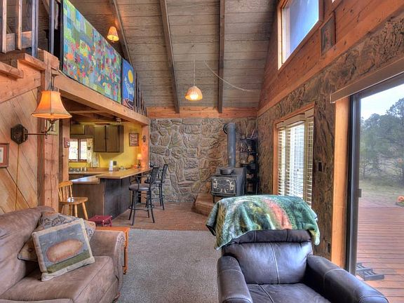 Two of the interior walls are inset with beautiful Petrified Woodstone which accents the toasty wood stove that heats the entire house. The kitchen is open to the living room and is separated by a bar counter. You can watch the wildlife out all windows as you prepare your meals or relax in the living room.There are two bedrooms on the main level and one newly remodeled and tiled full bathroom. The new forced-air furnace, appliances, new water heater are all in place.A brand new wood deck 12x20 & 7x40 enhances the main and side entry.