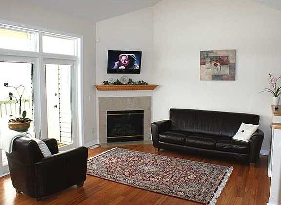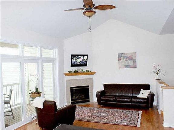 Waterfront Condo features hdwd floors, 3 bdrms, 2.5 baths. Main level: Living rm w/FP, Dining rm w/Bay window, cherry Kitchen w/island, granite counters & stainless appliances, 3rd bdrm, full bath. Lower level: Mst suite, 2nd bdrm, Family rm, Laundry, half bath, Den w/sliders to patio & dock. Panoramic view, Tax abatement through 2021.