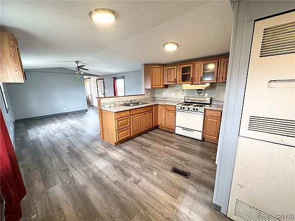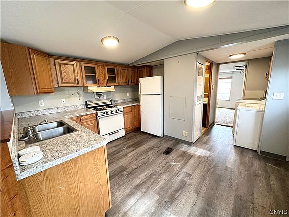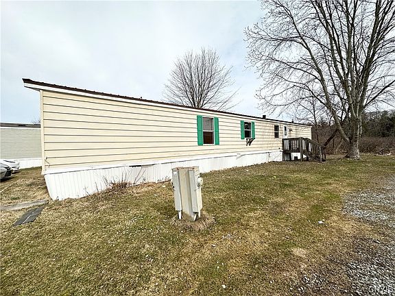 Affordable mobile home in Roxbury Mobile Home Park #190 nestled alongside Little Bay Creek! Three bedrooms, two full baths. Updates include laminate flooring in kitchen, living room, & hallway. Metal roof is only six years old. Includes all appliances; gas stove/range, refrigerator, washer, dryer, and folding tv mount & tv in back bedroom-a great space saver. Forced air heat & three window ac units included. Hot water tank is only six years old. Lot rent is aprox $448/month. New owner is repsonsible for water/sewer which is aprox $72/month. Contingent on lease approval through the mobile home park. Square footage was taken from previous mobile home bill of sale showing building dimensions of 14'x69'. Short drive to Oneida Lake, restaurants, & highways. Property being sold as-is.