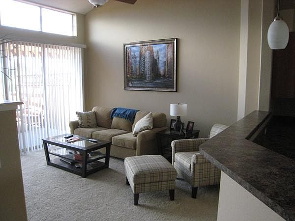 This is a 2 bed, 2 bath condo in the Gold Peak community of Palomino Park. The living area has vaulted ceiling throughout and a great secluded den. Updates include new stainless steel appliances, carpet throughout and fresh paint. The master has access to a patio and large walk-in closet. There are 2 private patios on the second floor including a hookup for a natural gas grill extended off of the living room. The garage is an oversize 2 car garage with plenty of extra room for storage. Just outside the front door is a community cabana and hot tub. Rent includes all Palomino park amenities like the pool, gym, as well as water and garbage utilities.