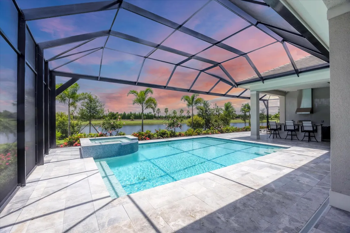- Pool features: Gunite, Heated, In Ground, Lighting, Outside Bath Access, Pool Alarm, Salt Water, Screen Enclosure