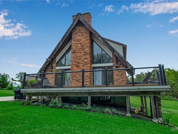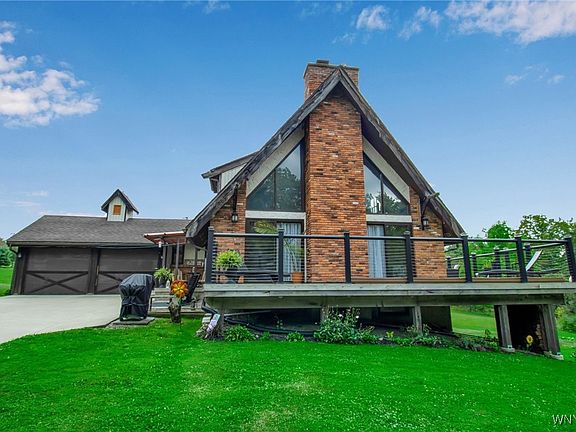 Charming Chalet-Style Retreat in Colden – East Aurora Schools! Nestled on a serene 1.9-acre hillside lot in the Town of Colden and located within the highly desirable East Aurora School District, this 3 bedroom, 1.5 bath Chalet-style home offers rustic charm, modern updates & room to grow. With 1,749 sq ft of living space, a walkout basement, and an attached 2-car garage, this property is perfect for those seeking privacy, character & convenience. Step inside to a stunning living room featuring soaring ceilings, exposed rustic beams, hardwood floors & a dramatic 2 story brick fireplace – the perfect cozy focal point. New light fixtures & ceiling fan add to the charm and comfort. The open-concept kitchen & dining area is ideal for entertaining, with plenty of storage, a pantry & included appliances. Step out the brand new sliding door onto the balcony & enjoy picturesque views of your private yard & fire pit. The first floor offers 2 generously sized bedrooms with excellent closets, a convenient half bath, laundry room, & a mudroom with access to the backyard. Upstairs, discover a spacious loft overlooking the living area, a private home office (with a closet – potential 4th bedroom) & the primary bedroom located near a full bath featuring a new vanity & tub/shower combo. The full walkout basement features tall ceilings, large windows & is ready to be finished thanks to egress access—perfect for adding more living space or a recreation area. You’ll also appreciate the newer furnace for year-round comfort. Just minutes to Kissing Bridge, Blueberry Treehouse Farm, Veterans Park & all the charm of East Aurora Village, this is a rare opportunity to enjoy country living with modern convenience. Don’t miss your chance to make this one-of-a-kind Chalet your new home!Join us for the Fall Foliage Open House – Saturday, 9/27 from 1–3 PM! Offers due Wed 10/1 by 12PM.