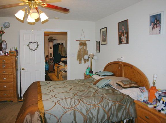 Spacious ranch with 2 master suites, one with huge walk in closet and office, 2 stone fireplaces (1 gas), lots of custom oak kitchen cabinets, mudroom off kitchen, 8 ceiling fans, privacy fence, cozy front porch with views, 2 storage buildings, fruit trees, new heat pump July 2014, double hung tilt windows, private rear deck, handicapped accessible with 2 ramps, horses allowed, 4 bedroom perk, 2 X 6 exterior walls. $2,500 Carpet allowance.