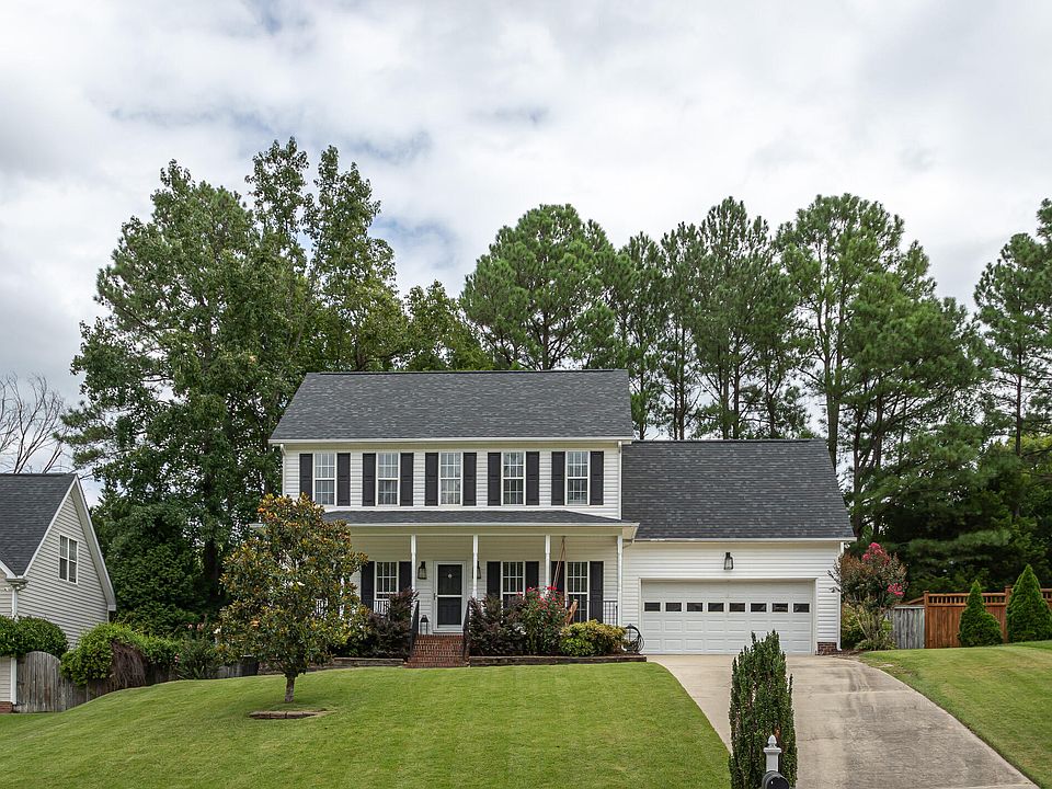 CHARMING COLONIAL home in an amazing location off Ligon Mill Rd with easy access to downtown Wake Forest and Routes 1 and 401! Currently used as a 4BR, this home has the flexibility to be a 3BR + bonus/flex/office space! Engineered hardwoods downstairs, carpeting upstairs. Separate dining room and updated kitchen with ample counter space, SS appliances and a peaceful view. Screened porch, large deck and a landscaped & fenced backyard. Enjoy Moss Creek's neighborhood pool, playground, and direct access to the Smith Creek Greenway just around the corner from this home. Freshly painted, deep cleaned, and move in ready!