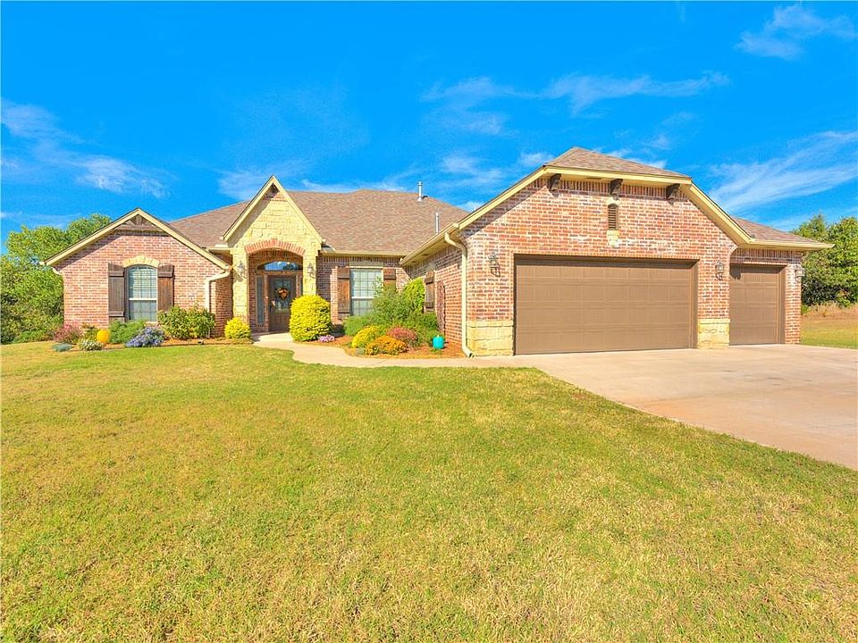 Beautiful, like new property on 1.07 acres in Carl Albert Schools away from the city! Beautiful landscaping on this nice lot with a outside firepace. Walk in to a wonderful living space with wood floors, stone fireplace with gas logs and a vaulted ceiling with wood beam. Enter the study through double doors which has wood floors with built-in bookshelves. Nice kitchen with large pantry and stainless steel appliances. The dishwasher is brand new! Primary suite and spa like bath with large walk-in closet that has access to the utility room. There is a half bath off the utility room along with a mud bench. On the other side of the home are the two secondary bedrooms with nice sized closets and a nice full bath between the bedrooms. The seller has added guttering, a storm shelter, outside storage building with double doors, irrigation system, and insulated garage doors and a water purifier.