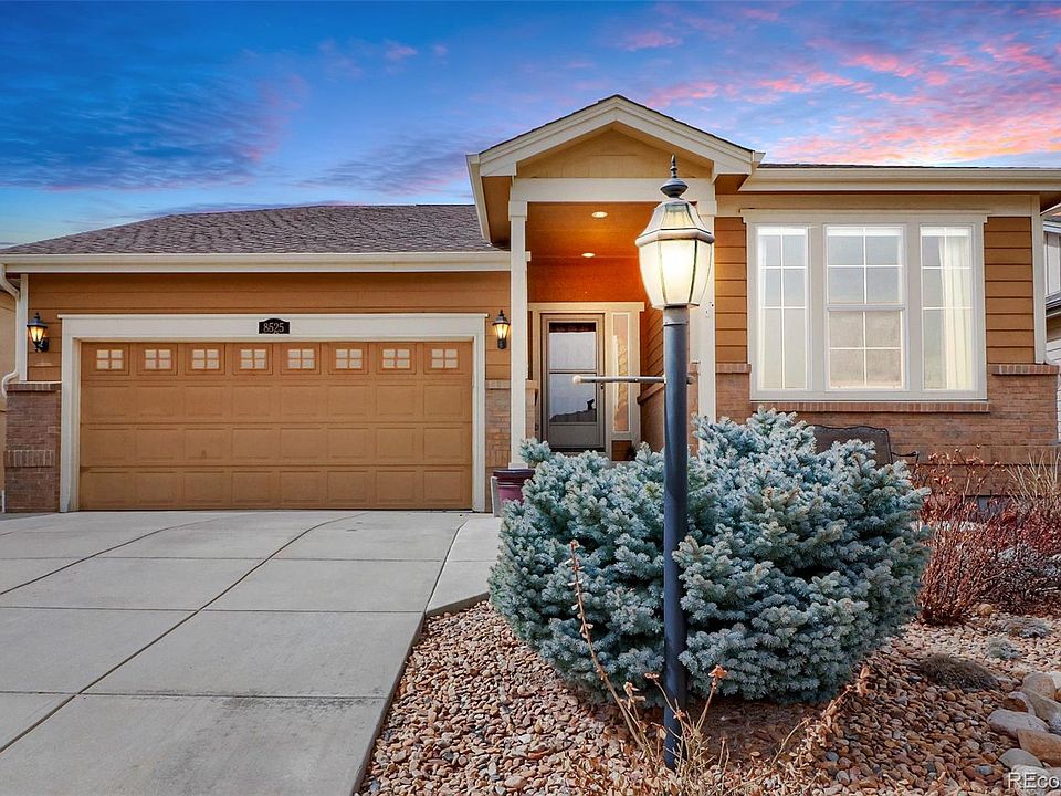 Welcome Home! This stunning ranch-style home with a full unfinished basement is located in the coveted 55+ Heritage Todd Creek community. This home has been beautifully maintained throughout the years and boasts high ceilings and gorgeous hardwood flooring throughout most of the main living areas. The xeriscaped front creates an attractive entry to the covered porch, which reduces water needs with local boulders and plants. The open-concept kitchen showcases a large center island, and an abundance of maple cabinets, granite countertops, and stainless steel appliances. The family room offers natural light and hosts a gas fireplace that provides warmth and a cozy atmosphere. The primary suite is tucked towards the back of the home with 2 large walk-in closets and an ensuite bathroom with a step-in shower and dual sinks. The dedicated home office with double doors can be used as a third non-conforming bedroom. Discover more square footage in the full unfinished basement waiting for you to enhance it with your personal touches or use it as storage space. Enjoy the outdoor space and dine al fresco on the covered back patio with roll-down sunshades for privacy. The home also features a 3-car tandem garage and a laundry room with a closet and laundry tub. Heritage Todd Creek is a quiet, gated community that offers desirable amenities such as a golf course, clubhouse, tennis courts, pickle ball, pools, and MUCH more!