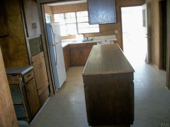 large front porch, back screen porch, kitchen w center island, living room w sliding glass door to front porch.