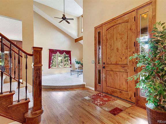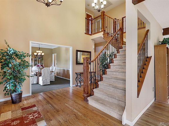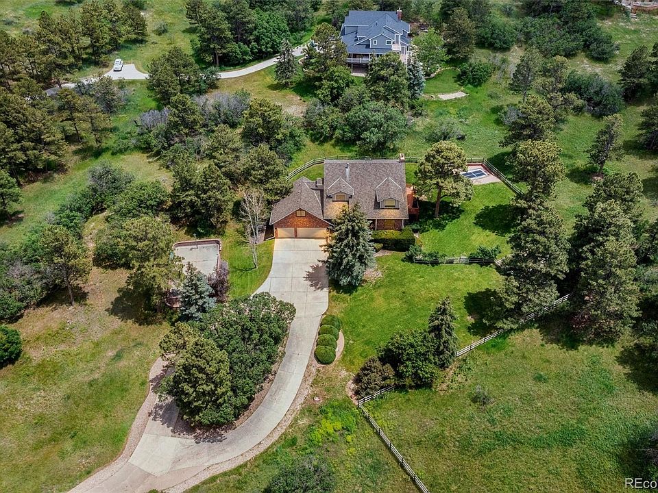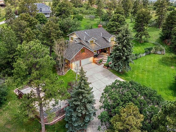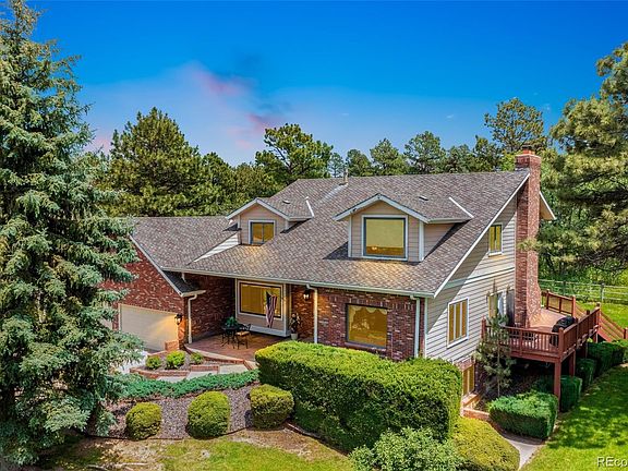 Amazing opportunity to own a stately Misty Pines home on a premium 2.3 acre lot surrounded by open space! Set back far from the street, a winding driveway surrounded by mature Pine trees leads to the inviting front porch. Brilliant natural light and space abound throughout the one-of-a-kind interior that has been lovingly-maintained by the same owners for over 30 years. Designed with entertaining in mind, gorgeous hardwood floors run throughout the expansive main floor that offers both formal and informal living and dining spaces. There is an elegant formal dining room with crown molding, a formal living room accented by a soaring vaulted ceiling, and an sprawling open concept family room and eat-in kitchen highlighted by a gas fireplace, handsome wood paneling, and exposed beams. Sure to delight the home chef, the gourmet kitchen features granite countertops, abundant cabinet space, a pantry, an island, and stainless steel appliances including a gas cooktop, double ovens, and a wine cooler. Two sets of sliding glass doors allow for a seamless connection to the wraparound deck that in turn connects to the lush fenced backyard. An open wrought-iron staircase leads to the second floor primary suite that features a large walk-in closet and a luxurious 5-piece bathroom with a jetted tub, a skylight, and a rainfall shower. More living space awaits in the finished walkout basement that hosts a substantial rec room with a wet bar, 2 bedrooms, and another bathroom. Additional noteworthy features include a central vacuum, a 3-car garage with storage, and a private tennis/basketball court. The best of both worlds; this gem is surrounded by natural beauty and mature trees that provide solitude and privacy but also enjoys quick access to central Parker, golf, and parks.
