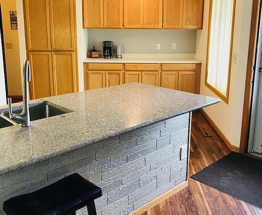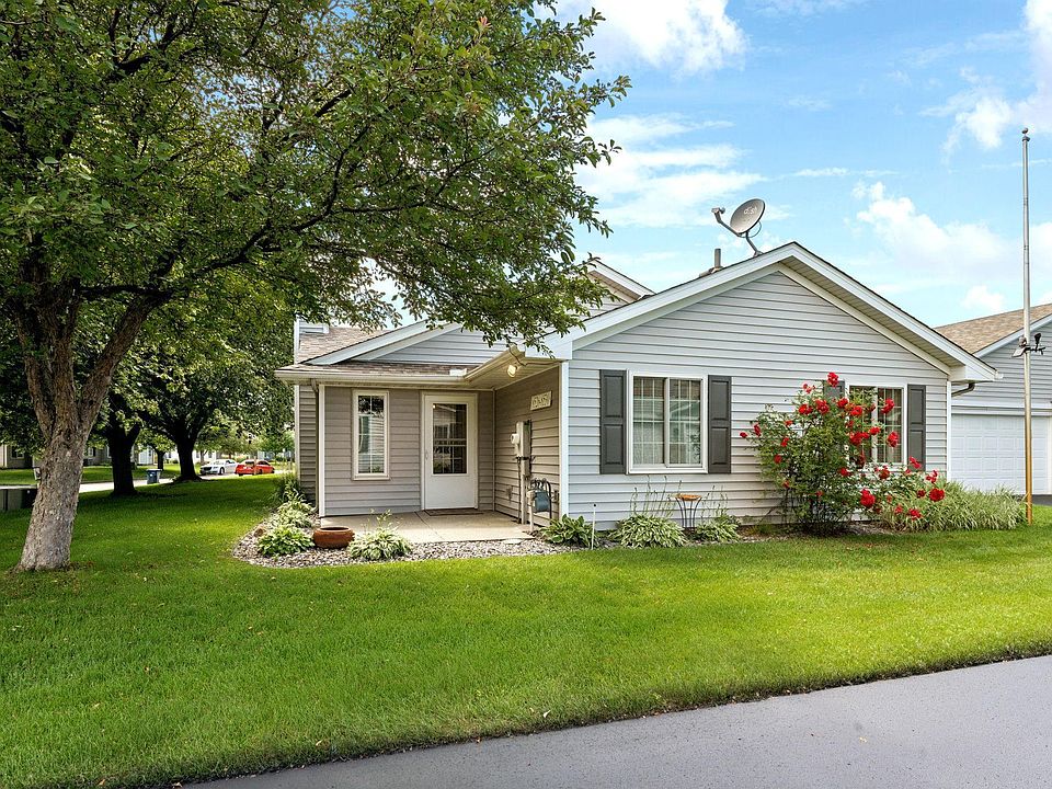Welcome to one level livingl This townhome has been updated with wood floors throughout, solid kitchen countertops and a walk in jetted tub with LED lights in the second bath. Featuring a sunroom with a gas fireplace and walk out to a patio for grilling or just relaxing. The main bedroom has a large walk-in closet and private bath with grab bars, walk in shower, and a ceiling solar tube to allow for extra natural lighting. The large 2-car garage has an additional workspace, a workbench and full attic storage space. A second patio is located at the front entry of the home. The roof was replaced in 2019 and new siding in 2022 The beautiful oak entertainment center can stay! These units sell fast so don't wait!