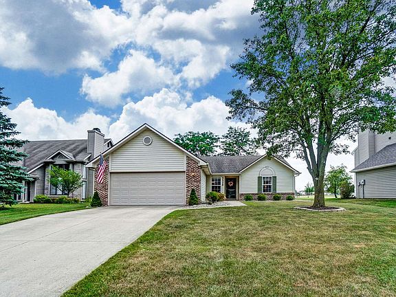 Great curb appeal. Move-in ready. This Ranch home offers a split floor plan with spacious rooms! Great room has cathedral ceiling with 2 sky lites, ceiling fan, gas brick fireplace and patio door that walks out to the oversized deck. Eat-in kitchen with lots of cabinets and counter space. Window that opens to the great room. All kitchen appliance to remain. Large master bedroom with walk-in closet and full bath. 2 car garage with pull down attic with floored storage space. Back yard has a view of Whispering Meadows school soccer field. Furnace and AC just serviced.