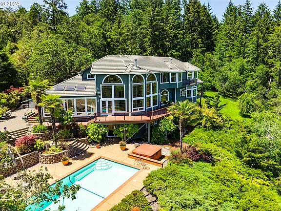 Custom-built estate with unparalleled Easterly views of the majestic Three Sisters mountains! Situated at 970 feet in elevation, you will find yourself above the clouds year-round! Expansive windows and panoramic vistas, this property provides a luxurious and serene living experience. Located in the South Hills on 8.65 acres with easy access South Eugene shops, University of Oregon and downtown. Gated entry welcomes you to a peaceful setting w/abundant wildlife. Home offers 2 bedrooms upstairs, one being the primary suite w/features such as a jetted soaking tub, private sitting deck, walk-in closet with laundry chute, marble walk-in shower, and propane stove. The main level includes a second primary suite with a walk-in closet, en-suite bathroom, and access to the vaulted sunroom and side yard. The living room boasts a two-story wall of windows, electric blinds, built-in cabinets, wood floors, wood stove, and access to a large deck overlooking the pool and valley below. Connecting formal dining, coffee/wine bar, and a breakfast nook with access to the covered patio and BBQ area. Lower level offers spacious family/billiard room with a bar/kitchen area, slider access to pool patio, propane fireplace. Two more large bedrooms on the lower level with a shared bathroom, half-bath and lots of storage. The outdoor features include a dreamy in-ground pool with a remote-controlled cover, automatic cleaning, and a diving board, and a hot tub, as well as a pool house with a full bathroom, shower, sauna, sink, and room for a twin bed. Fenced garden area with inground sprinklers, mature landscaping and walking-paths. Detached studio building with counters/sink, room for a double bed and a wrap-around deck, ideal for a hobby room, guest house, or gym. Detached 36x13 RV/boat storage or shop. There is a 38x23 workshop under the home with garage door, concrete floors and exterior access. Built-in automatic generator, 4 water heaters, 2 propane storage tanks and so much more!