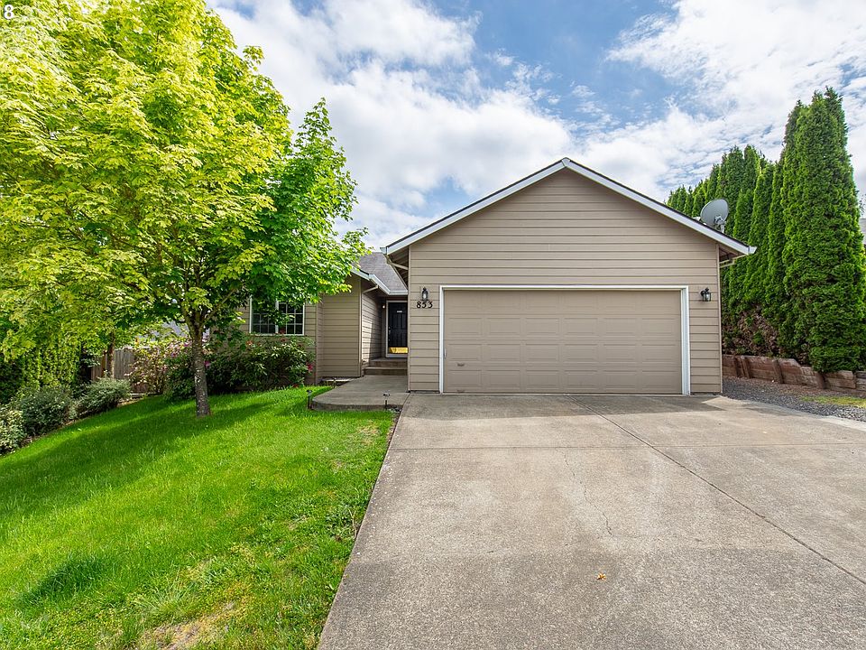 Open and cheerful one-level in quiet cul de sac with RV parking! Inside: Greatroom design, Hardwood floor, double-paned vinyl windows, forced-air heat, vaulted ceiling and gas fireplace. French doors open to private, fenced back yard with raised garden beds and stone patio. Newer interior paint, newer carpet in bedrooms. Separate laundry room, tons of extra storage in garage. Master with double-door entry, dedicated bath.