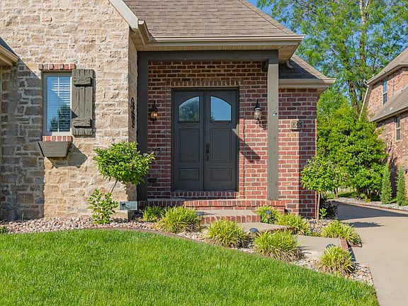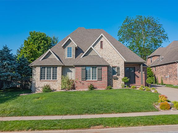 Welcome to this stunning story-and-a-half, brick and stone home nestled in the sought-after Villages of Wicklow. Boasting 4 spacious bedrooms, 3 full bathrooms, and 2 inviting living areas, this thoughtfully designed home features the perfect floor plan for everyday comfort and effortless entertaining. Cathedral ceilings with exposed beams and reclaimed hardwood flooring are some of this homes standout features. The kitchen is a dream with a granite countertops, generous island and an oversized storage pantry.Functionality meets style in the charming mudroom complete with a custom organizational system along with a mail drop station. A bonus room upstairs provides a perfect second living space for a playroom, crafts, or a movie night with friends and family. Don't miss the spacious storage area located directly off the bonus room. A storm shelter entrance was added in the primary bedroom closet for added safety. Step outside to enjoy a peaceful covered porch with a classic swing, or gather around the fire pit in the beautifully landscaped backyard. Don't miss your chance to own this beautiful, well-maintained home in the award winning Nixa School District!